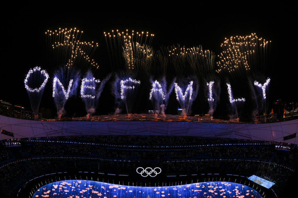 在北京第二十四届冬季奥林匹克运动会闭幕式上,“鸟巢”上空的焰火显示出中文“天下一家”和英文“ONE FAMILY”字样