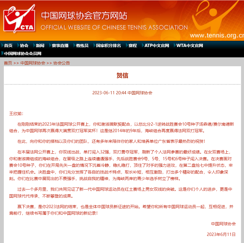 在王欣瑜和谢淑薇夺得法国网球公开赛女双冠军之后,中国网球协会向王欣瑜发出了贺信。