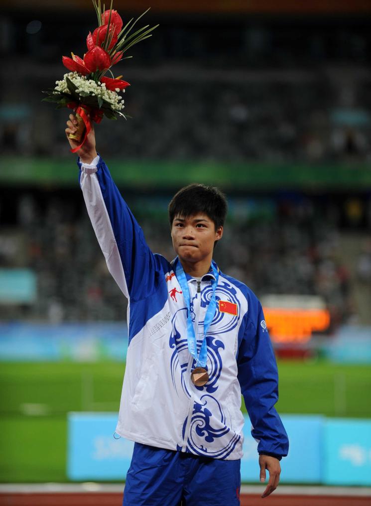 2011年8月17日,中国选手苏炳添在深圳大运会田径男子100米项目的颁奖仪式上。新华社记者 公磊 摄