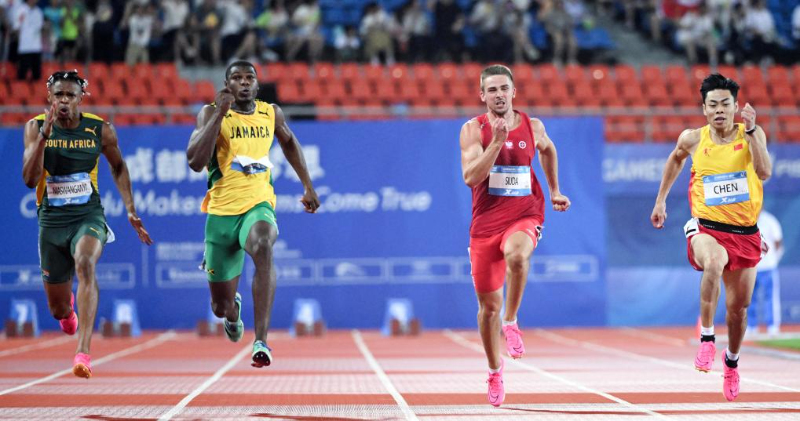 8月1日,陈冠锋(左)在成都大运会田径男子100米预赛中。新华社记者 贾浩成 摄