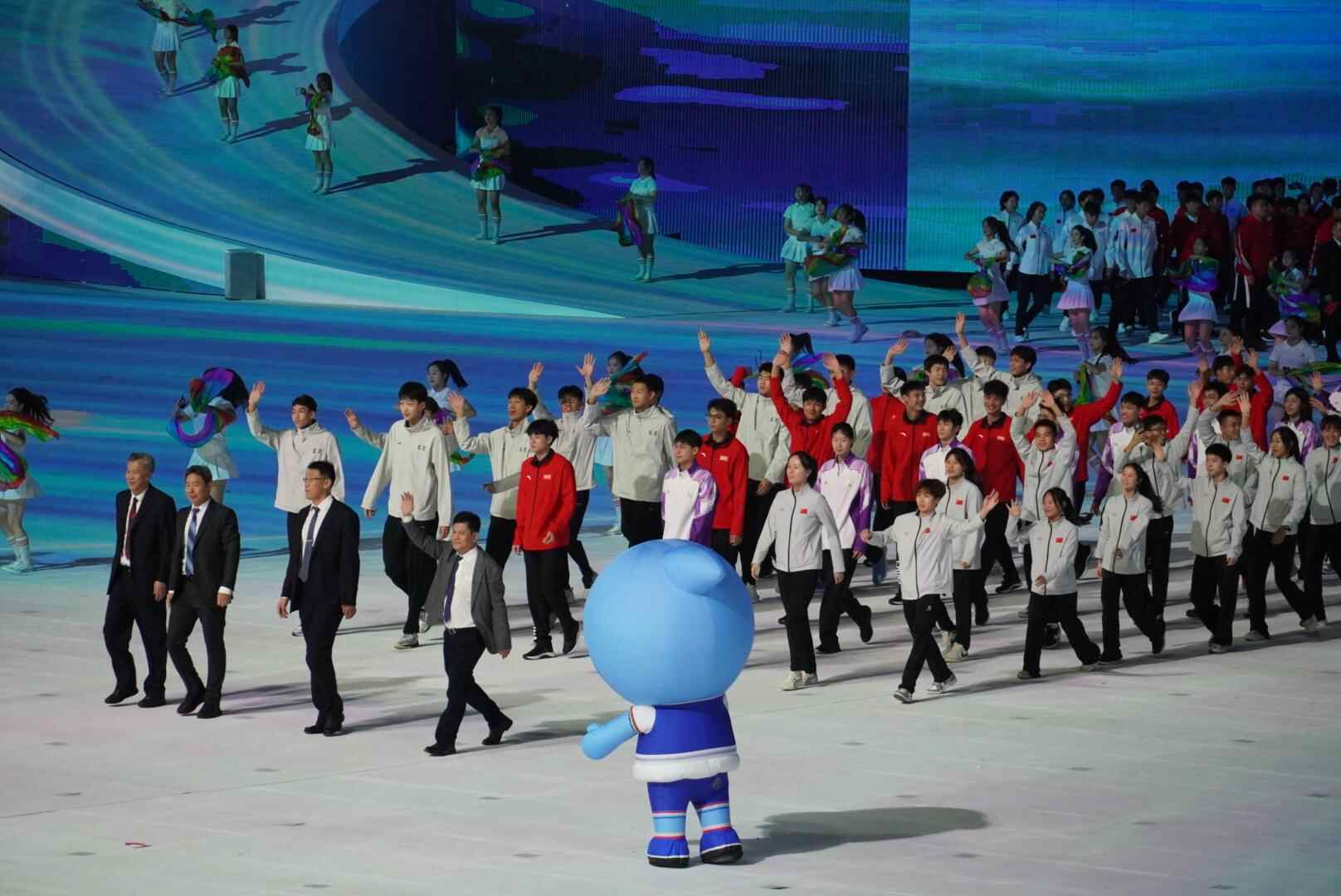 开幕式舞美以赛道的延伸、拓展和螺旋上升为形态,构筑充满想象的青春空间,寓意学生青年一代在赛道上奋勇前行、奔赴未来。