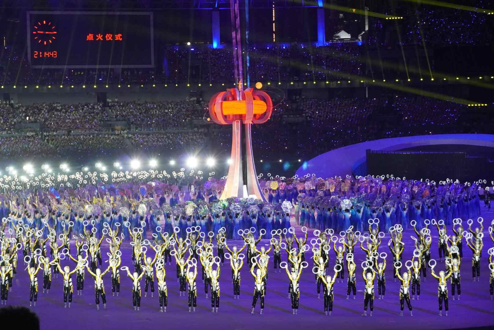 开幕式分为暖场表演、体育仪式、文体展演三个部分。其中,文体展演节目以“在青春的赛道上”为主题进行设置,由《青春的山河》《青春的接力》《青春的奔跑》三个篇章和尾声《青春万岁》组成,尾声《青春万岁》包含了火炬传递和点火仪式。