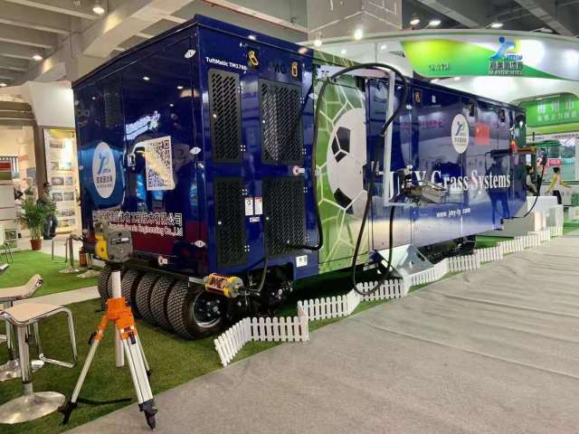 在本次广东体博会上,深圳嘉美茵体育工程技术有限公司展位上的一辆深蓝色长方形汽车格外惹人注目。从外部来看,这辆汽车看不到轮胎、座椅和方向盘,但仔细研究才发现,这个名为“锚固型混植机JMY Grass Systems”的“汽车”可谓它大有玄机。