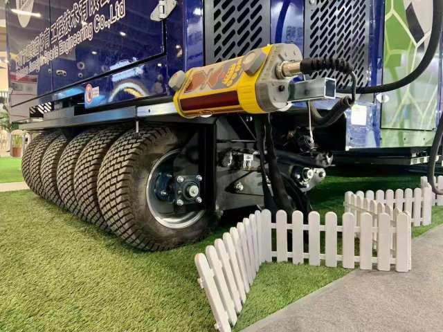 “这是一台专业足球场地施工养护机,被誉为足球场地建造领域的光刻机。它通过作业,直接提升场地草坪的耐健康性和排水能力,”该公司副总经理林俊伟介绍,“设备在作业过程中给草地打孔,将人工草植入场地,可以将场地的使用率提升三至四倍,将渗水功能提升八倍。更重要的是,植入的人工草与植物草有着最高的相似度,从而直接提高球员的体验感。”
