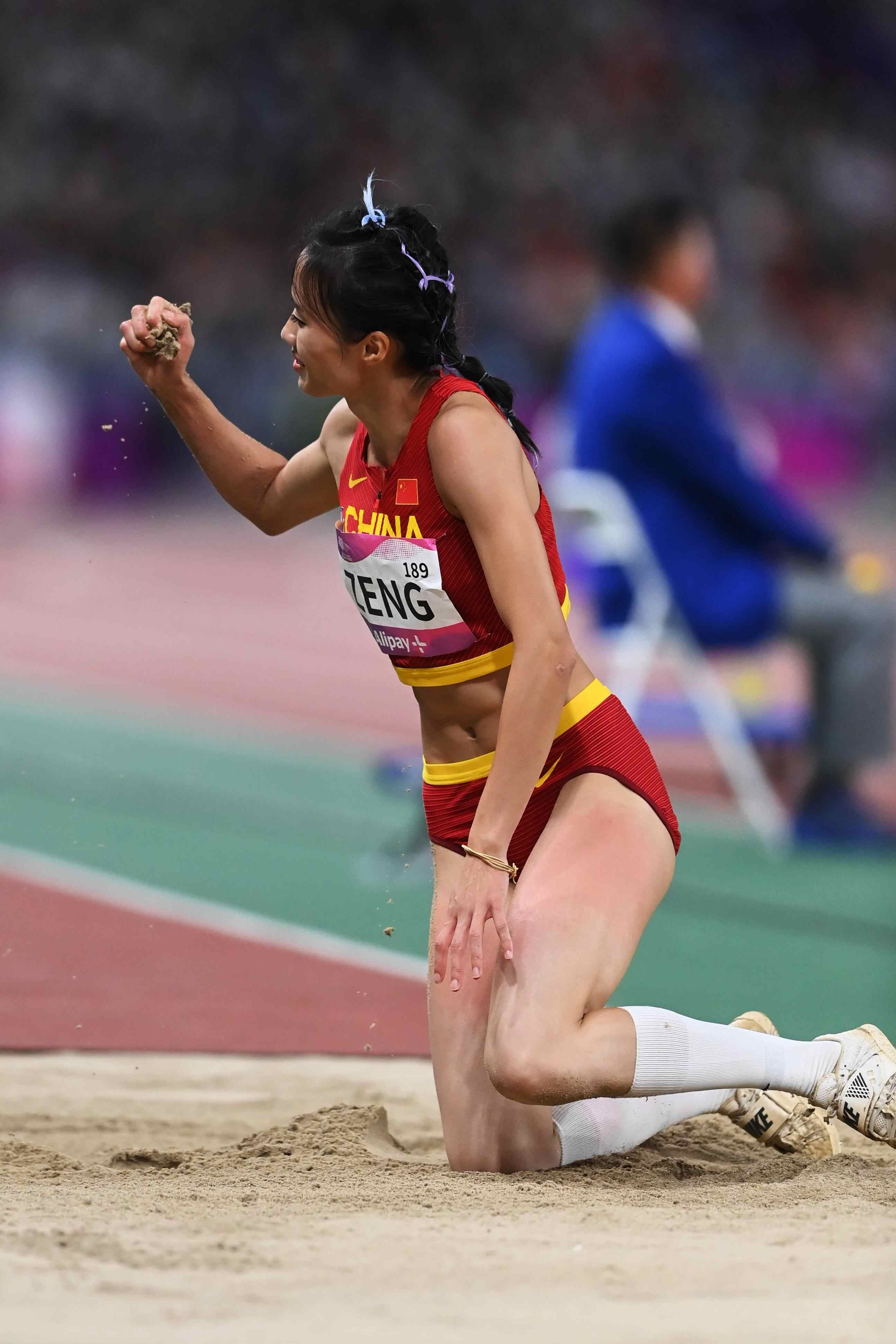 曾蕊在前五跳并未找到自己熟悉的节奏,在第六跳前,仅凭借第四跳的13米71排名第四。眼看即将无缘领奖台,曾蕊在最后一跳孤注一掷,最终以13米92的成绩有惊无险地摘得银牌。