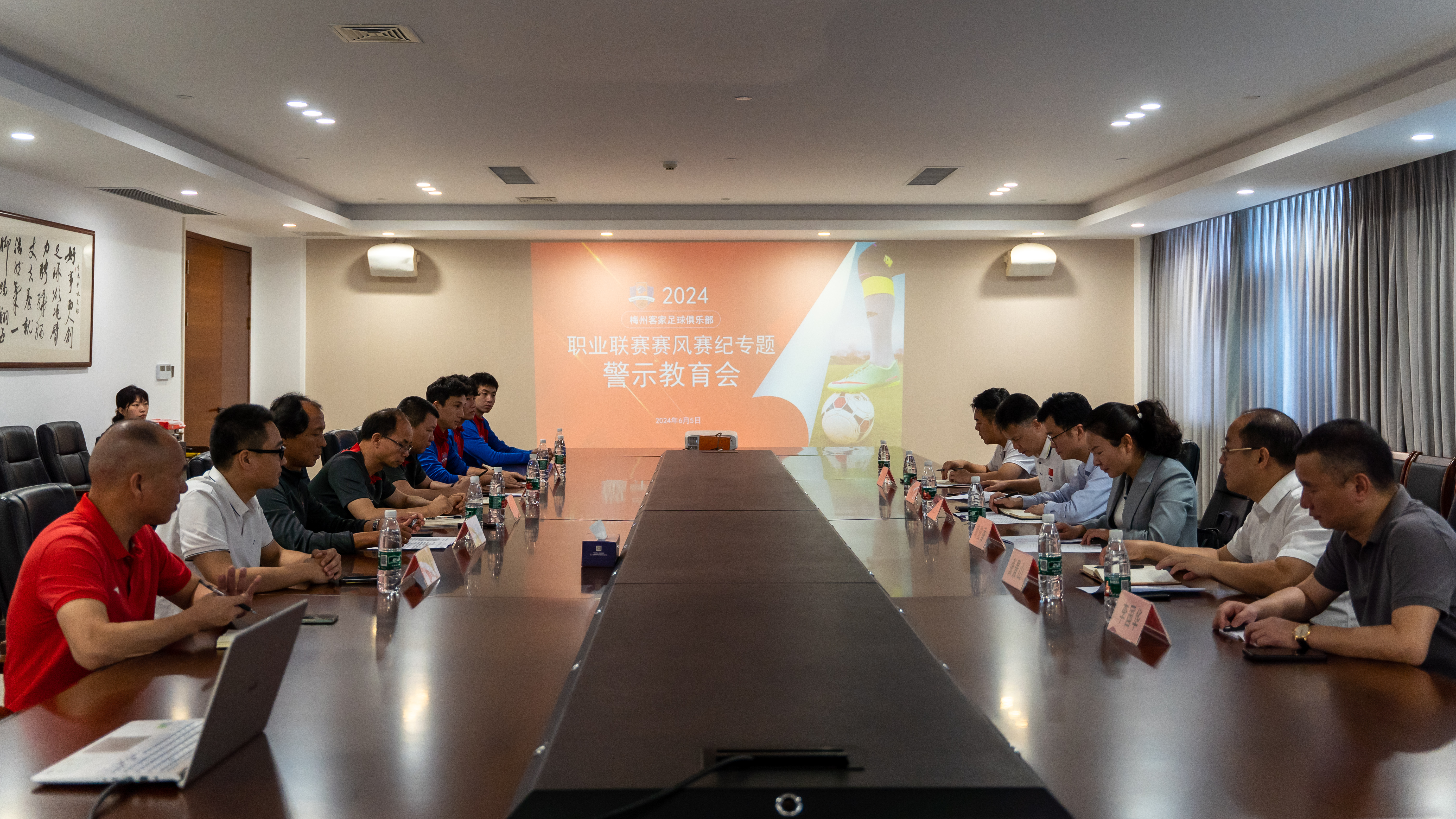 会上传达了有关职业联赛赛风赛纪,梅州客家队代理主帅曲刚汇报了2024年中超联赛梅州客家俱乐部执行赛风赛纪相关情况,并表示将组织全体人员深入学习赛风赛纪的相关规定和政策,严格执行俱乐部的各项赛风赛纪管理制度,让每一位球员都能明确自己的责任和义务,自觉维护赛场秩序,确保训练和比赛的各个环节有序进行。梅州客家足球俱乐部负责人、一线队领队、队长、球迷会代表轮流作表态发言。