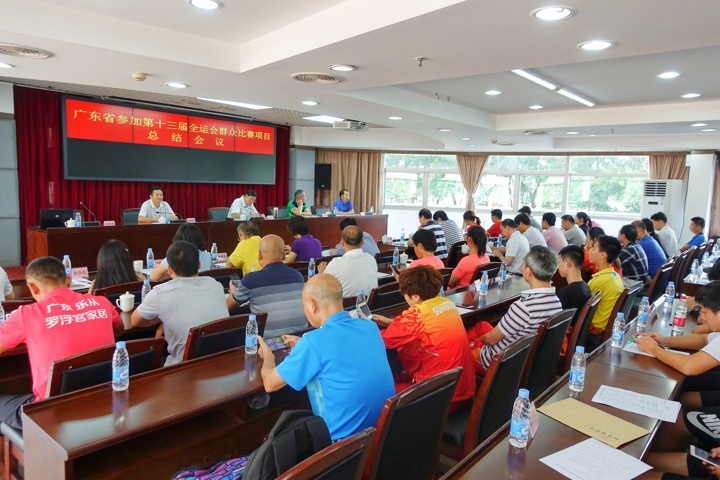 9月28日下午,广东省参加第十三届全国运动会群众比赛项目总结会议在吃瓜网 召开。省体育局招少鸣副局长出席会议,广东代表团各部门负责人、承担全运会参赛任务的单位负责人、领队、教练员、运动员代表以及新闻媒体等110人参加会议。
