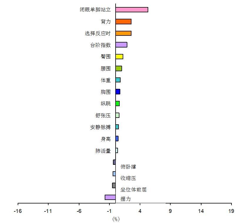 0~39岁女性的身高、胸围、安静脉搏、舒张压、握力、坐位体前屈、1分钟仰卧起坐、纵跳、闭眼单脚站立、选择反应时等指标有所增加,幅度在0.2%~10.3%之间;体重、臀围、收缩压、肺活量、台阶指数、握力、背力等指标有所降低,幅度在0.1%~2.0%之间(图9)。