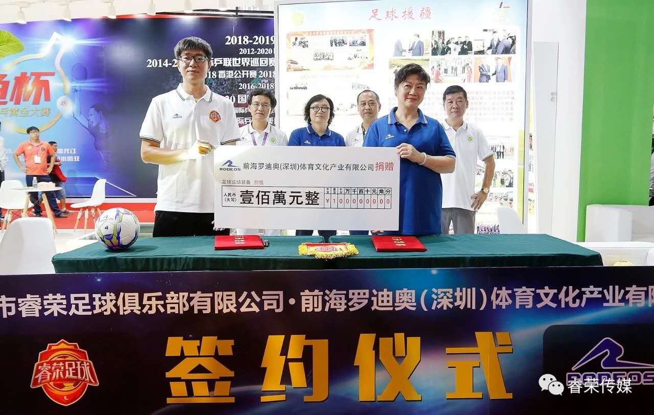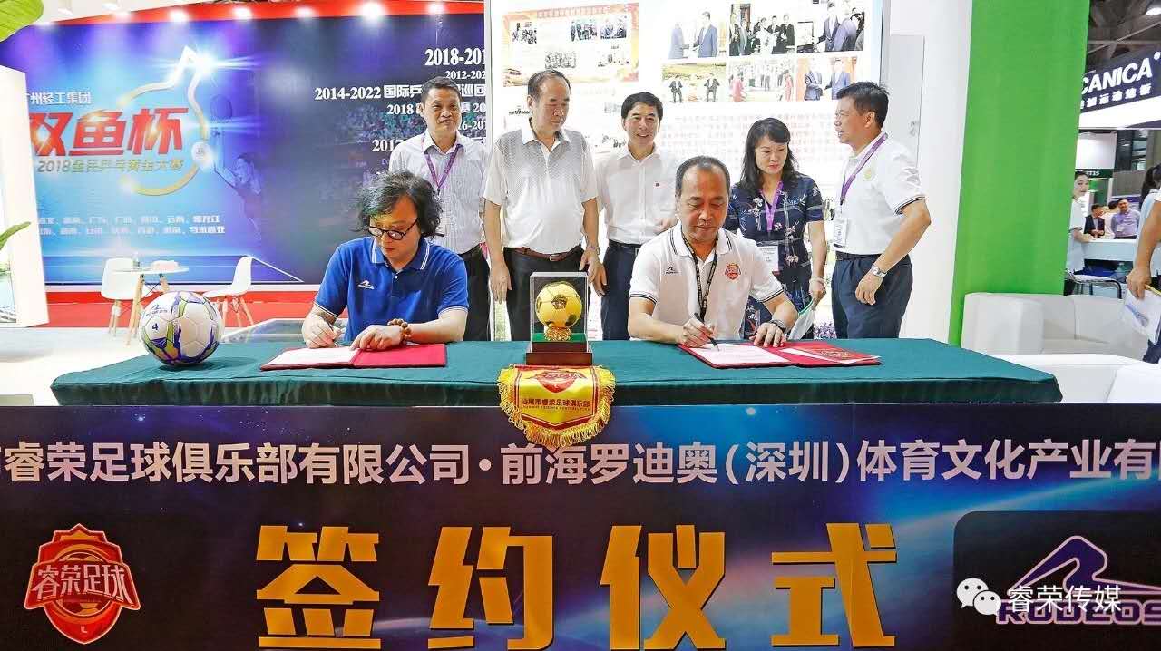 秋空蓝碧,微风送爽。9月14日,2018广东体博会在广州琶洲会展中心的保利世贸博物馆盛大举行。在本届体博会上,来自深圳的前海罗迪奥体育文化产业有限公司与汕尾睿荣足球俱乐部在吃瓜网 、足协的领导和参展者的见证下,举行了现场签约仪式,仪式内容主要为今后的战略合作,其中包括了罗迪奥体育文化产业有限公司向汕尾睿荣足球俱乐部捐赠价值100万元的足球运动装备。