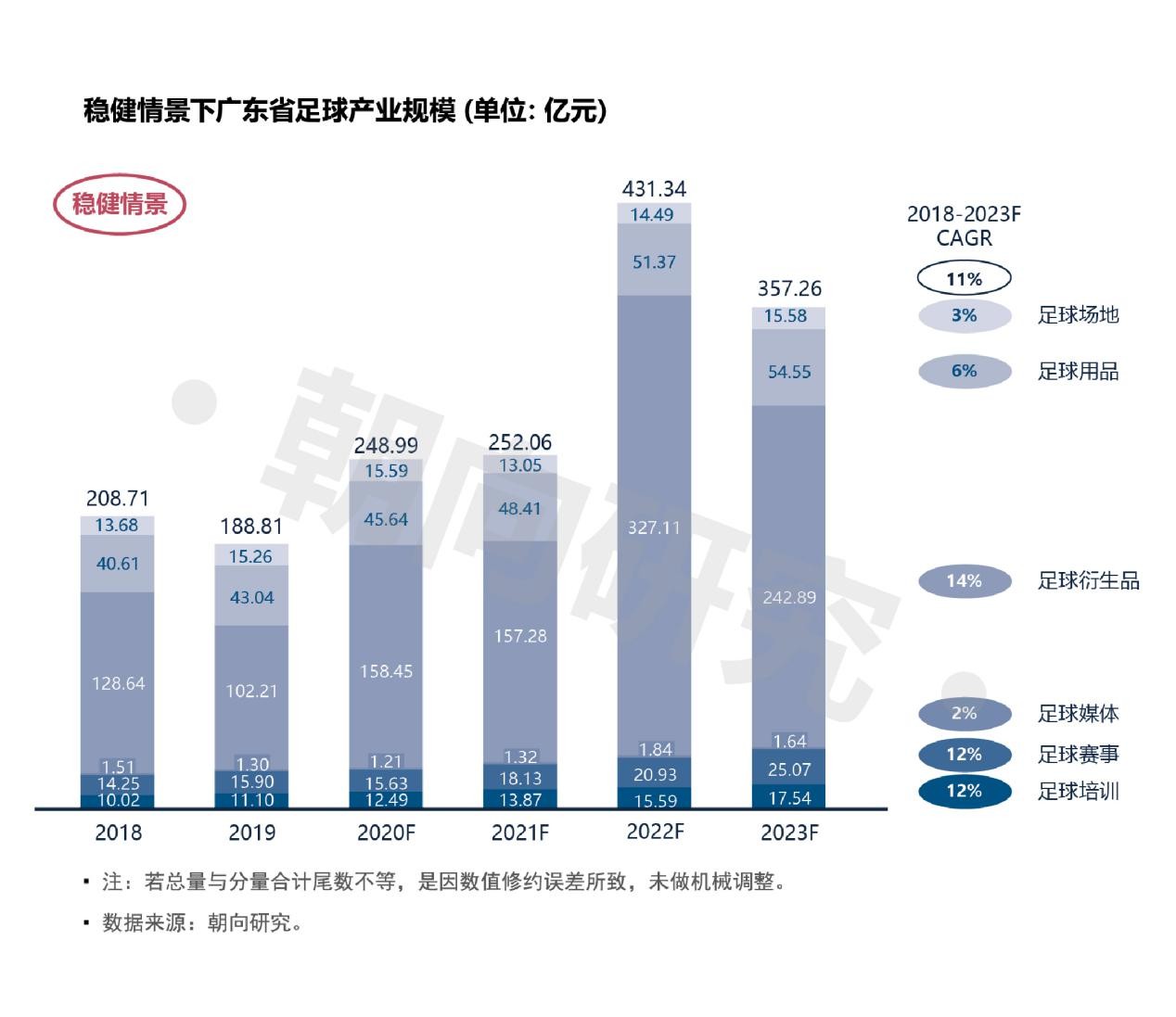 稳健情景和乐观情景下的数据差异显示,利好因素有力拉升足球媒体、足球培训、足球赛事市场的年复合增长率,其市场潜力有待释放。