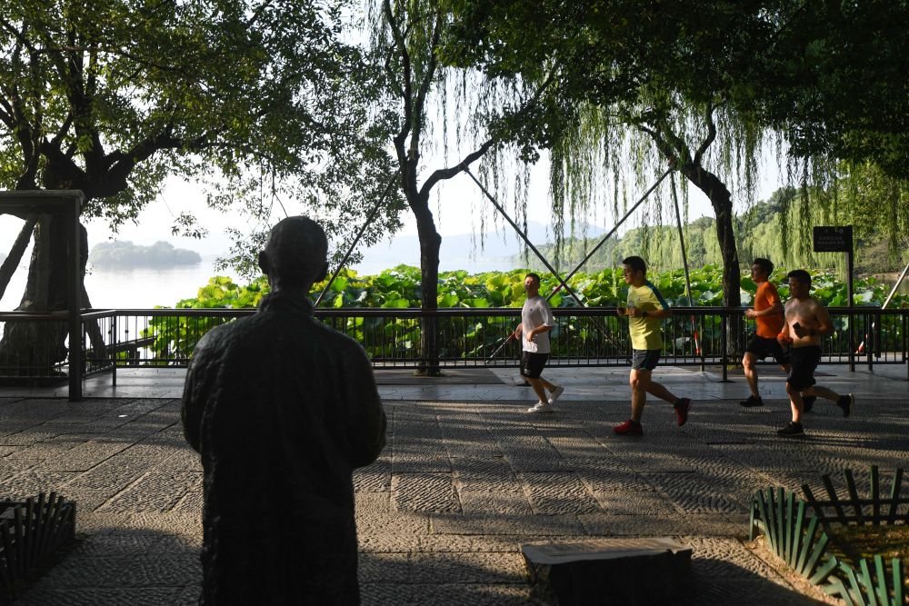 健身爱好者在西湖边跑步锻炼。新华社记者 黄宗治 摄