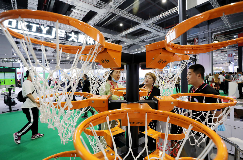 2021中国国际体育用品博览会,参观者在一组篮筐产品旁交流讨论。新华社记者 方喆 摄