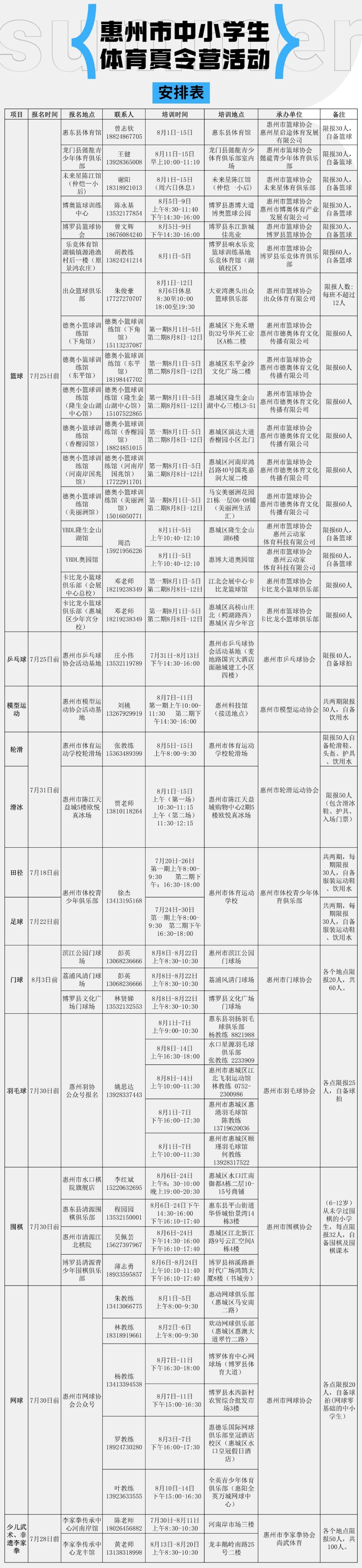 为推动全民健身活动及学校阳光体育运动的广泛开展,丰富学生假期生活,惠州市文化广电旅游体育局将于暑假期间举办2023年惠州市中小学生体育“夏令营”活动,对本市初中、小学生进行相关运动技能培训。