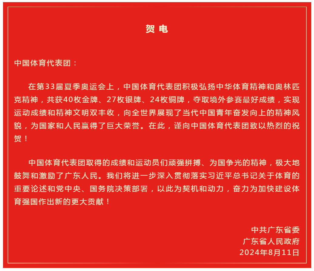 广东省委、省政府向中国体育代表团发出贺电,全文如下: