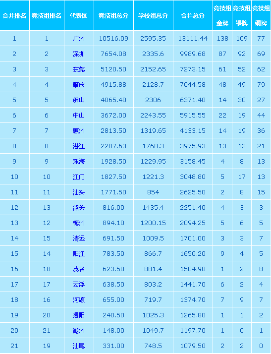 经过为期4天的激烈角逐,8月13日,广东省第十五届运动会学校体育组田径项目比赛在肇庆市体育中心田径场全部结束,湛江市代表队以533分的总成绩荣获团体总分第三名。